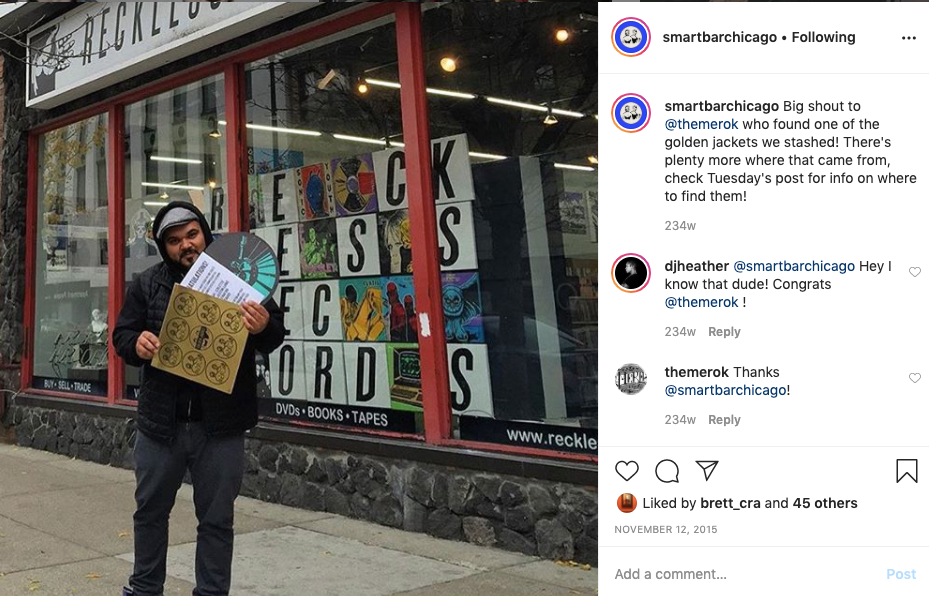 I had custom vinyl record sleeves screen-printed by a local printer, then hid them in record stores throughout the Chicagoland that we would partner with for ticket giveaways, surprise drops and more.
